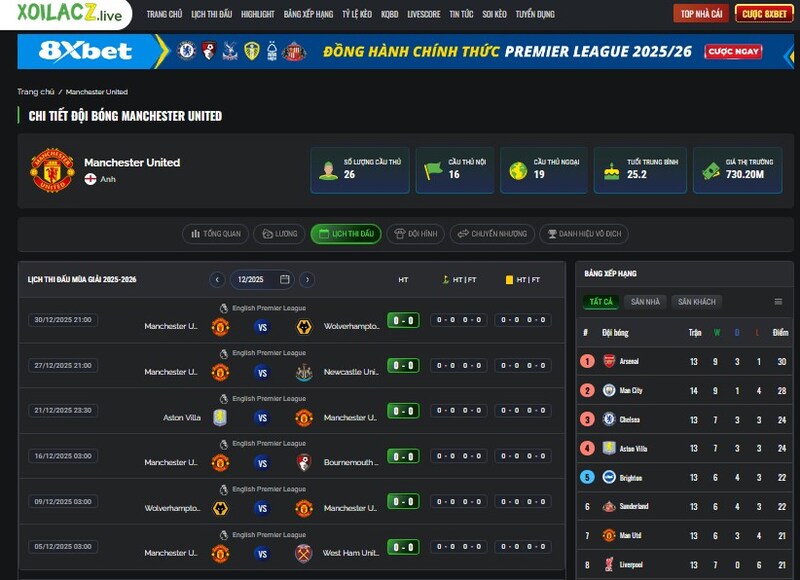 Xoi LacTV có tính năng lọc lịch theo đội cực kỳ tiện lợi. Chỉ cần chọn M.U, toàn bộ lịch thi đấu m.u từ vòng 1 đến vòng 38 sẽ hiện ra, kèm:
